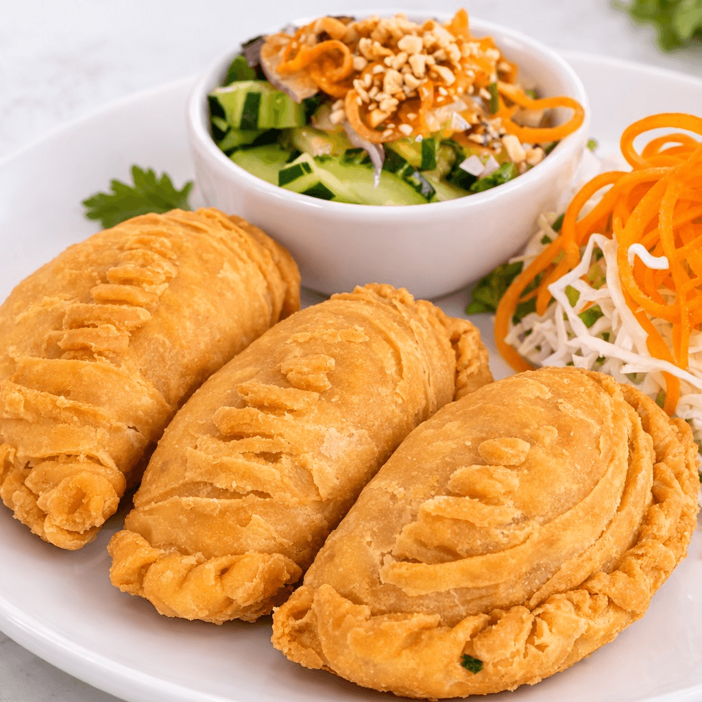 Crispy pastry 3 stuffed with vegetables and potatoes serve with cucumber salad.