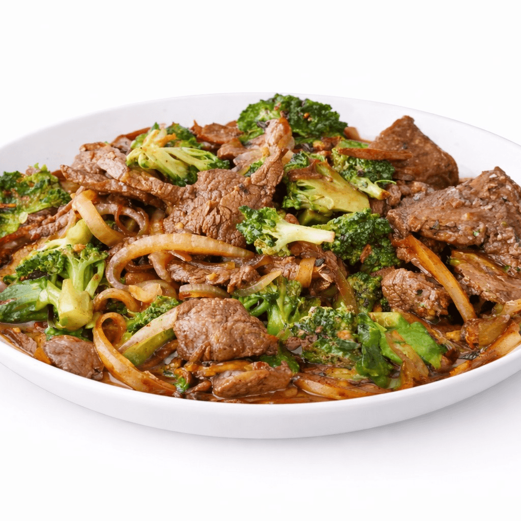 Sautéed beef, broccoli, and onions in garlic gravy sauce