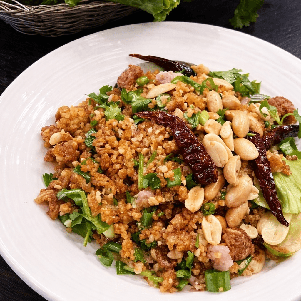 Fried tofu salad with red onions, mint leaves, cilantro, and roasted rice in lime dressing