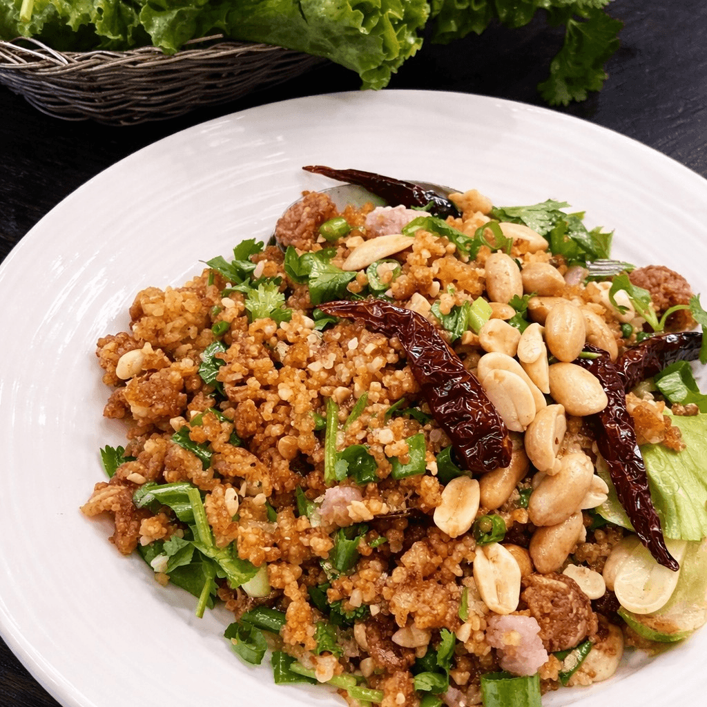 Choice of ground chicken, beef or pork mixed with red onions, mint cilantro, lime juice and ground roasted rice