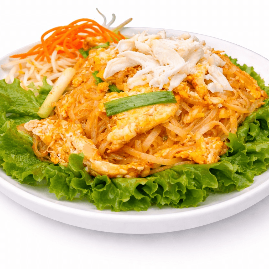 Stir fried spicy Thai noodle with Dungeness crab, egg and green onions