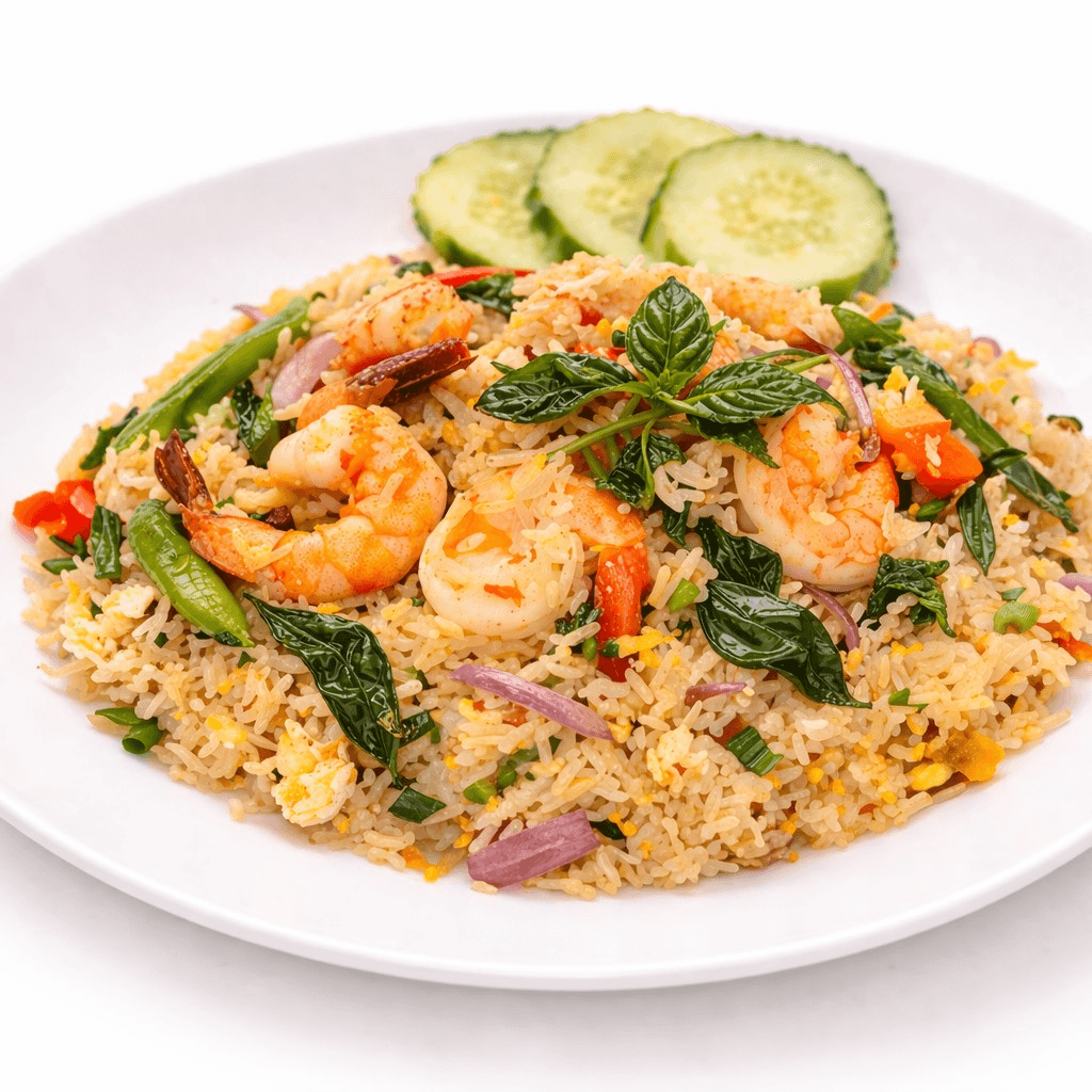 Thai style fried rice with shrimp paste, shrimp, eggs, broccoli, onions, and chili