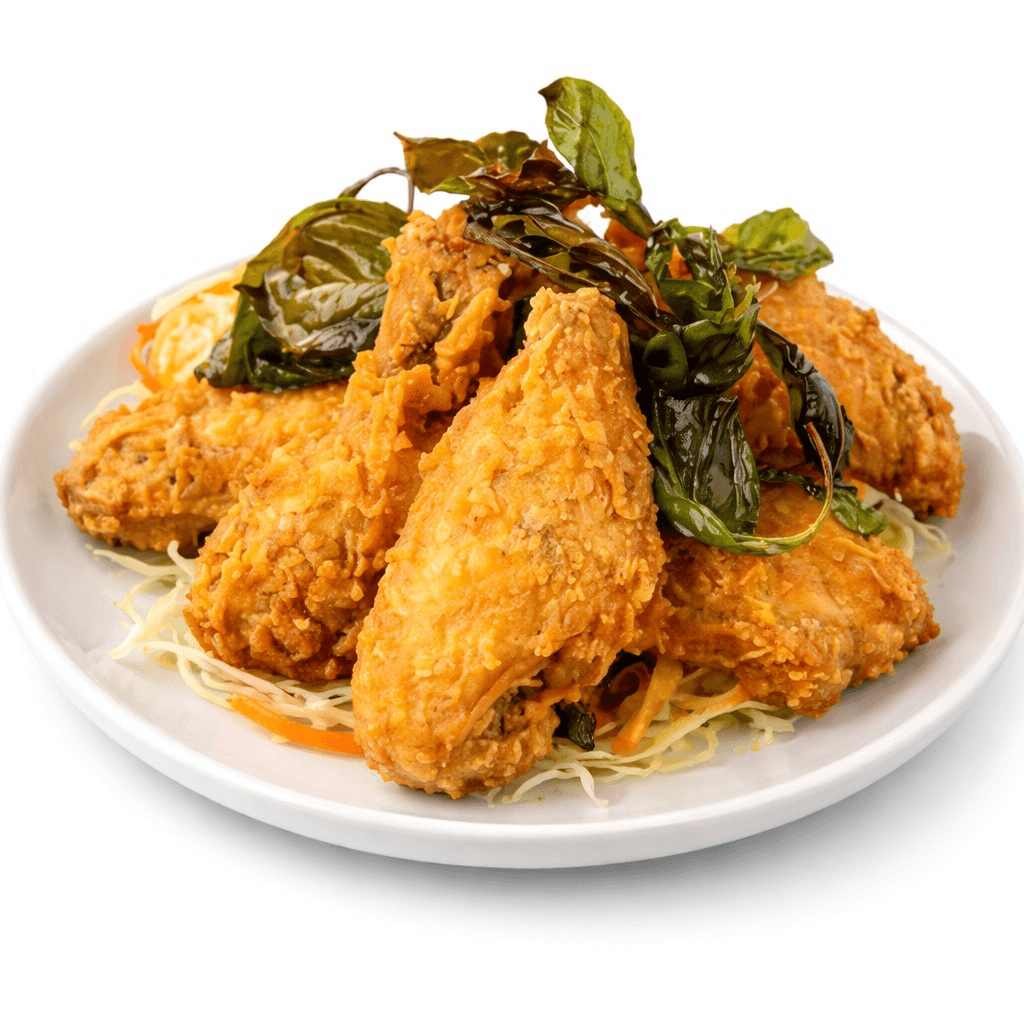 Deep fried whole tilapia topped with red bell pepper, onions, chili paste and crispy basil leaves