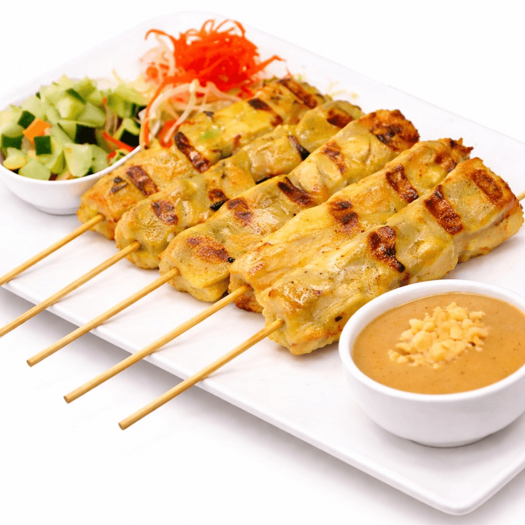 Grilled chicken shewers marinated in herbs, spices, and yellow curry served with peanut sauce and cucumber salad