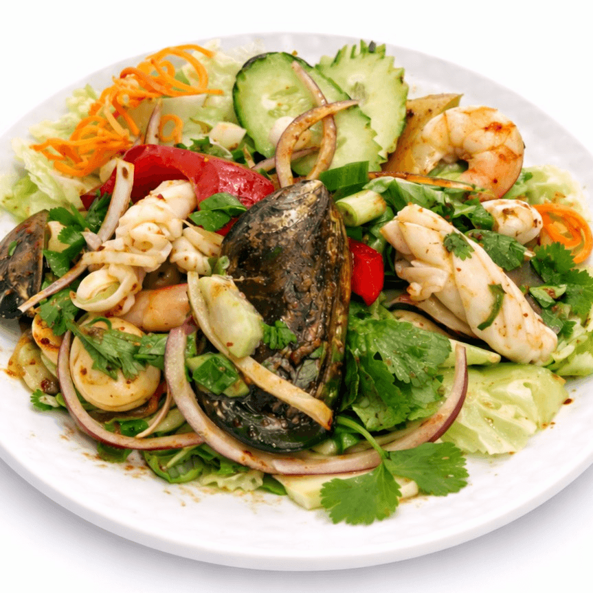 Combination seafood salad mixed with onions and chili paste in lime dressing sauce
