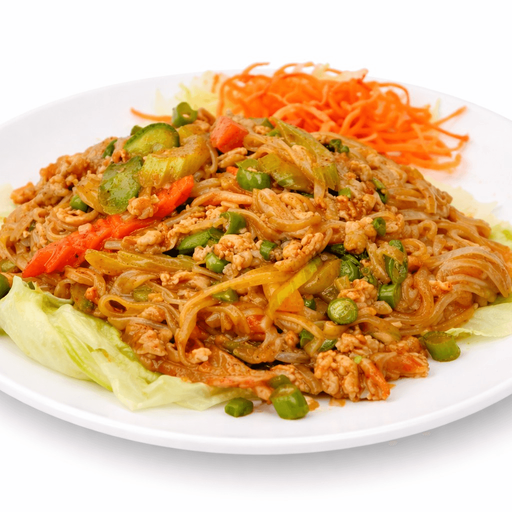 Stir fried rice noodle with ground chicken, onions, diced green beans and red bell peppers