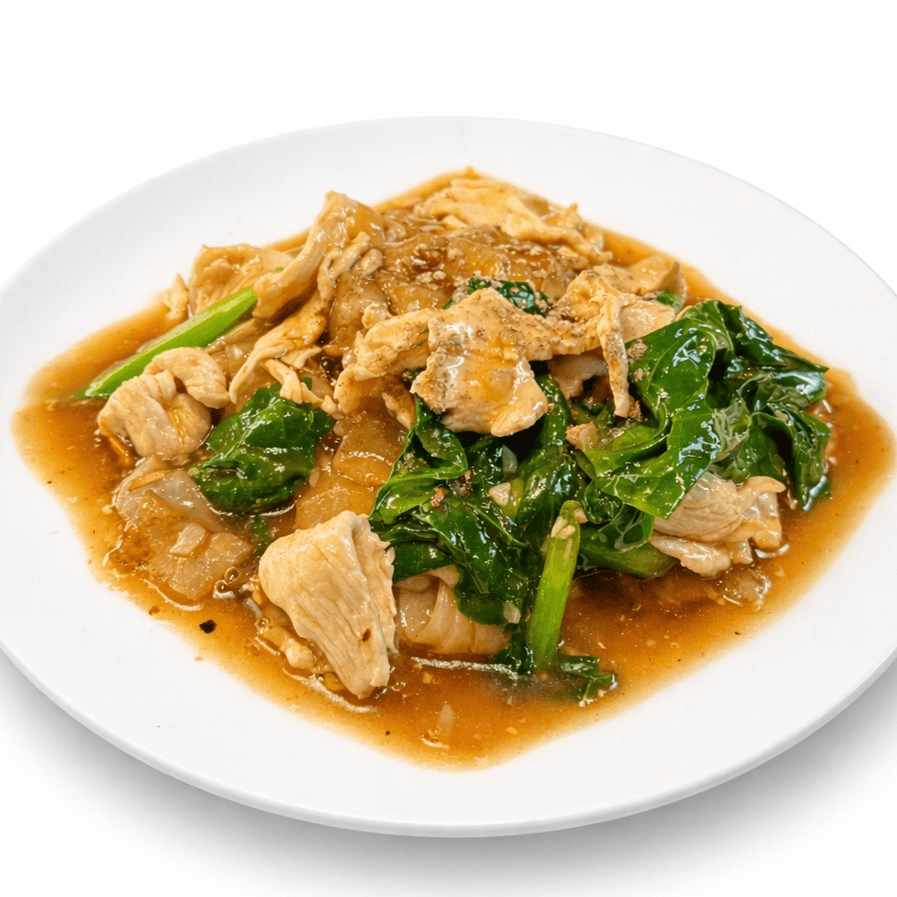 Stir fried wide rice noodle in gravy sauce with broccoli and carrots