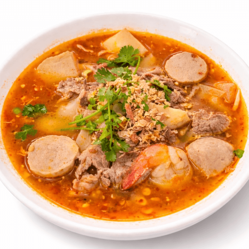 Hot and spicy noodle soup served with ground pork, sliced pork, pork balls, shrimp, fish, and ground peanuts