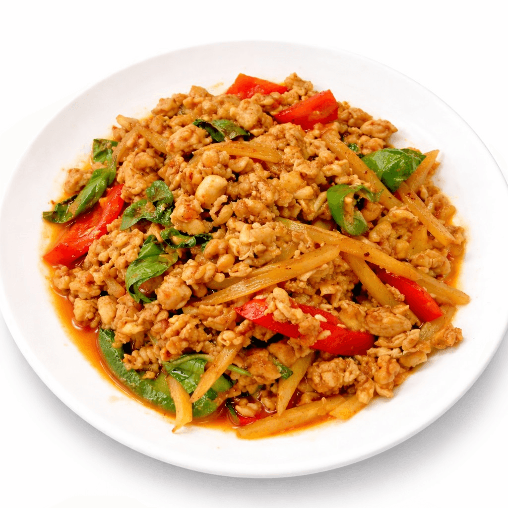Stir fried pork in house made chili paste, eggplant, basil, red bell peppers, and rhizome