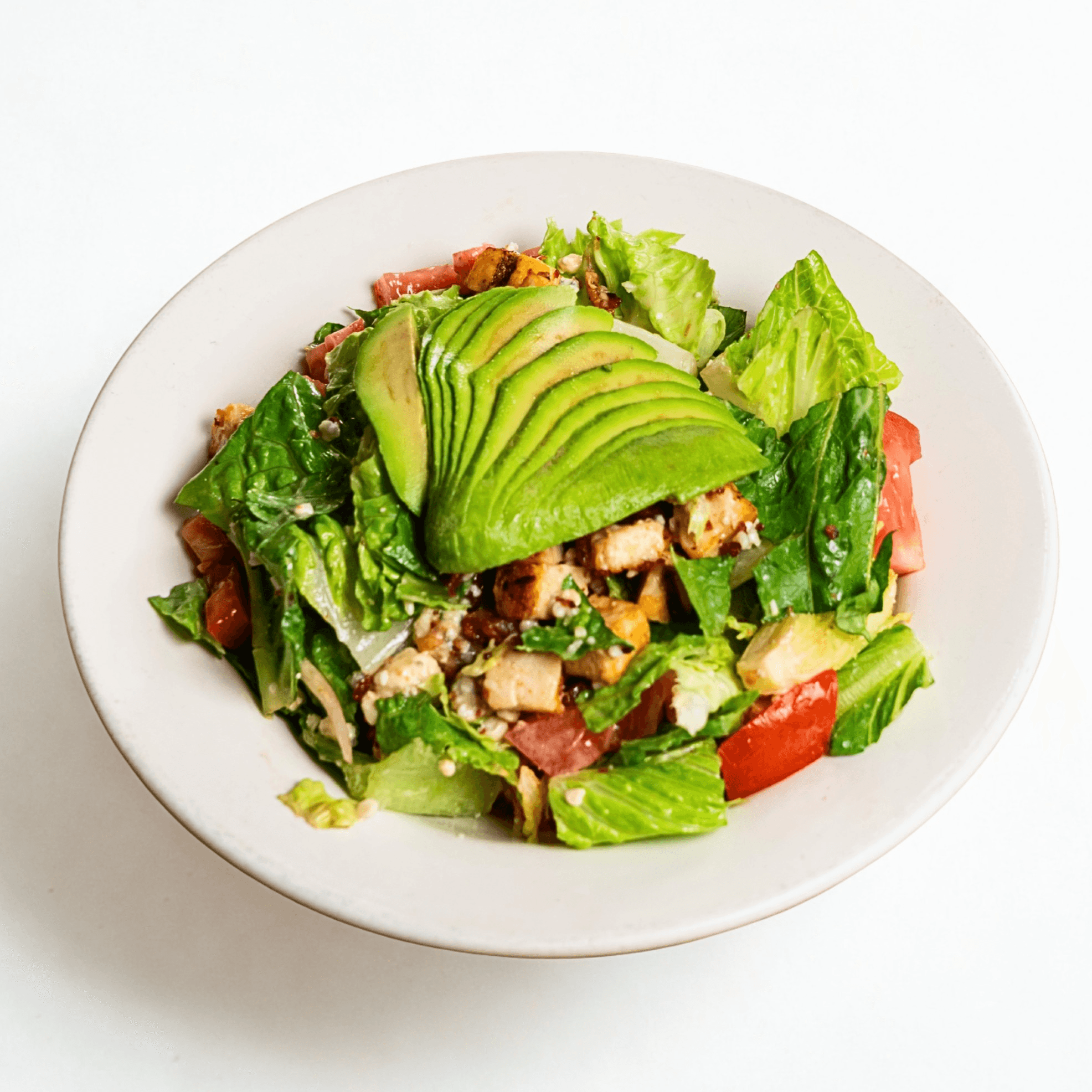 Romaine lettuce with garlic oil, Parmesan cheese, feta cheese, croutons, chicken, and Caesar dressing